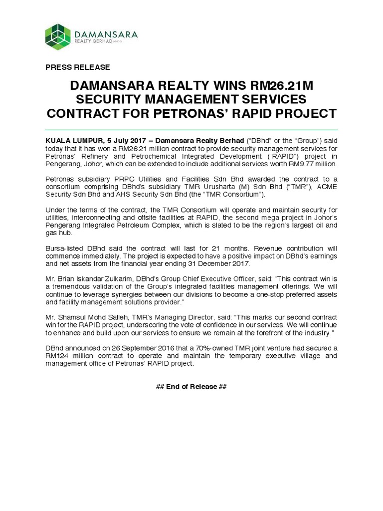 Damansara Realty Wins Rm26 21m Security Management Services Contract For Petronas Rapid Project Investing Business